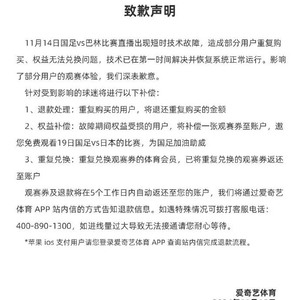 当晚22时23分,爱奇艺体育在微博道歉称,因球迷的热情,造成瞬时流量过大。技术服务资源分配超出限额,给部分用户造成了不好的观赛体验。后续会进一步加强技术预案和运营能力,提供更稳定可靠的直播服务。