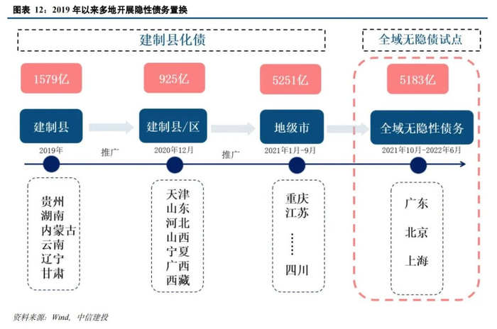 第一阶段:2019 年至 2021 年 9 月,建制县发行政府债券置换隐性债务试点并扩围。