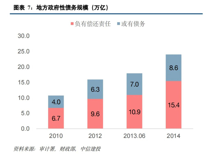 经清理核查,2014 年末全国地方政府负有偿还责任的债务余额 15.4 万亿元,或有债务(负有担保责任的债务、可能承担一定救助责任的债务)8.6 万亿元。