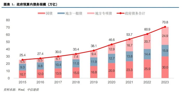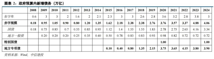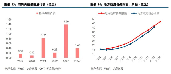 2023 年财政部安排了超过 2.2 万亿元地方政府债券额度(其中特殊再融资债券约 1.4 万亿,特殊新增专项债约 3000 亿),2024 年又安排 1.2 万亿元的额度(特殊再融资债券约 4000 亿,特殊新增专项债约 8000 亿),支持地方特别是高风险地区化解存量债务风险和清理拖欠企业账款。