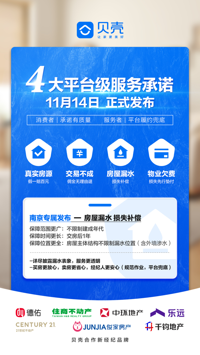 11月14日,贝壳找房举办“贝壳城市线2024公众媒体开放日”活动,正式对外发布“贝壳平台级服务承诺”,并在此次推出“3(全国)+3(部分城市)”平台级服务承诺专项。其中,贝壳南京站覆盖的四项服务承诺包括“真实房源、假一赔百元”、“交易不成,佣金无理由退”、“物业欠费、损失先行垫付”以及“漏水披露、损失补偿”。同时,贝壳宣布设立1亿元的平台赔付保障资金,为选择贝壳的消费者提供更全面的服务保障。