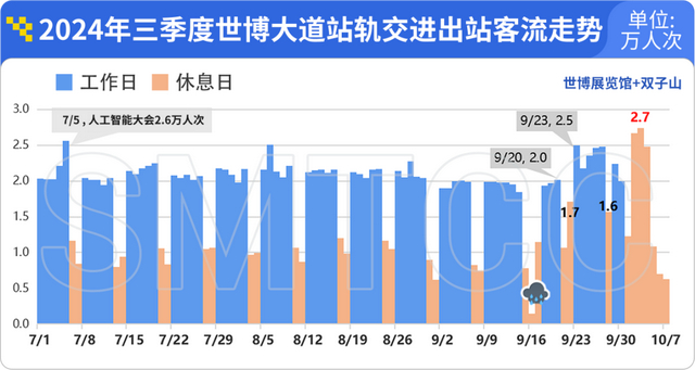 值得一提的是,新建地标带动了周边地铁站客流显著上涨。9月20日,海拔48米的“双子山”所在的世博文化公园南区开放,与世博展览馆共享轨交世博大道站。“双子山”开放后工作日进出站客流较非会展日增长2成;而休息日增长更显著,国庆假期最高日客流达2.7万人次,超过了7月初人工智能大会2.6万人次的客流峰值。