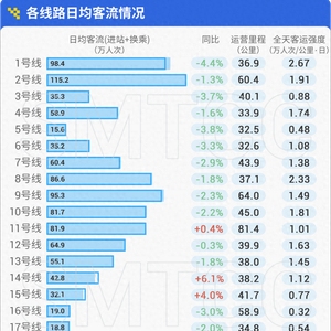 线路客流排名情况,2号线、1号线和9号线日均客流依然位列前三;同比维持较高增幅的线路分别是14号线和15号线,同比分别上升6.1%和4.0%;全网日均进出站客流排行前五的站点分别为虹桥火车站、人民广场、南京东路、上海火车站、陆家嘴;客运强度方面,1号线由于运营里程短,强度达到了2.67万人次/公里·日。