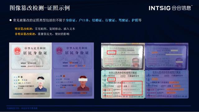 以身份证检测场景为例,当你拍摄身份证照片上传电子系统审核时,受所处环境光线影响,照片经常会出现反光现象,再加上部分用户会给身份证套上一层塑封包装,加剧了信息的模糊程度。机器要在排除这些外部因素干扰的基础上识别照片是否存在贴图、复制移动、插入文本等多种篡改形式,增加检测难度。