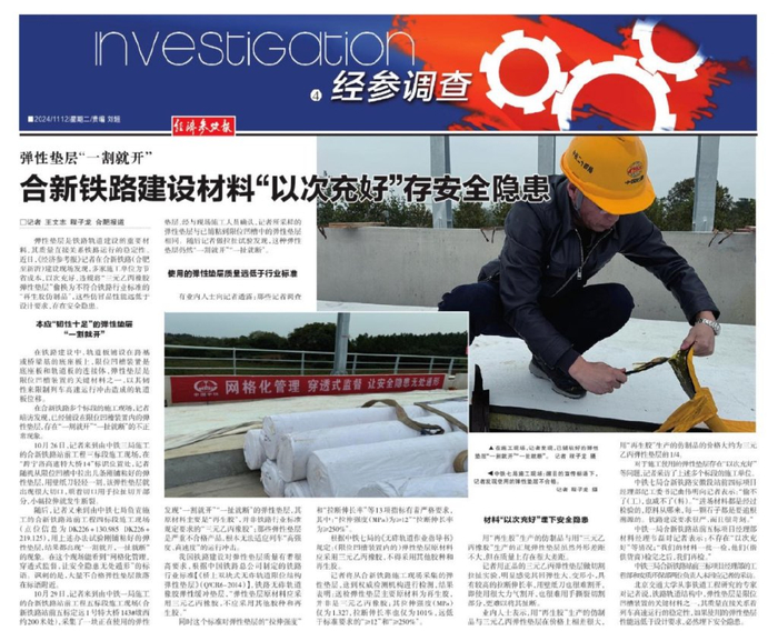 11月12日,新华社《经济参考报》刊发记者王文志、程子龙采写的调查报道《弹性垫层“一割就开”,合新铁路建设材料“以次充好”存安全隐患》一文。