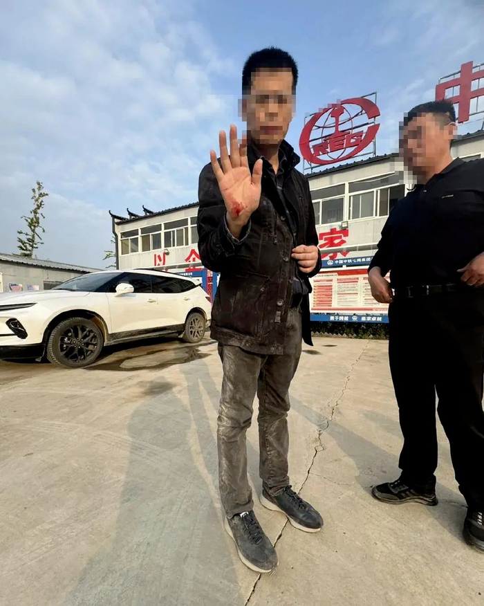 新华社《经济参考报》调查记者王文志右手受伤并带有明显血迹。