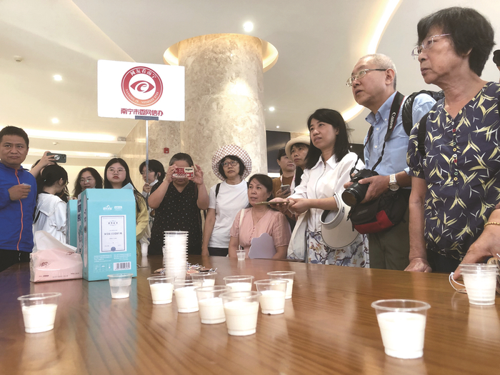 网友们在广西皇氏乳业有限公司参观,品尝明星产品。▲