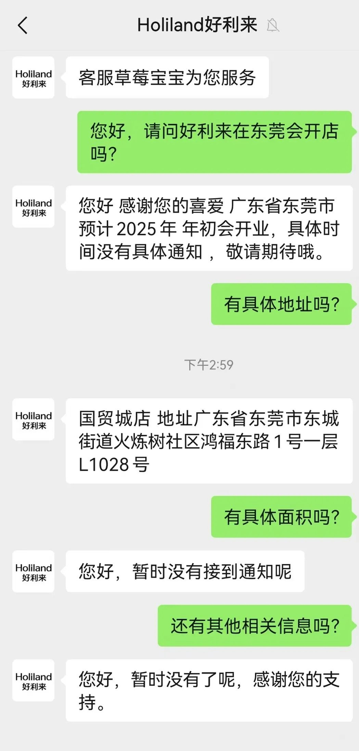 经过记者实地走访和多方求证,目前通过好利来官方公众号客服回复得知该品牌门店确实将进驻东莞,该店为东莞首店,位置为国贸城店(东城街道火炼树社区鸿福东路1号一层L1028号),预计2025年年初开业。