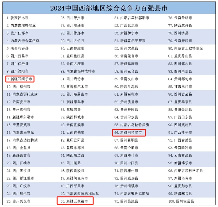 兵团3地上榜2024中国西部地区综合竞争力百强县市名单