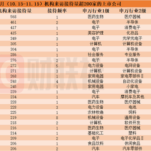 据Choice数据显示,截至发稿,近一个月(10.15-11.15)包括迈瑞医疗、闻泰科技、立讯精密、珀莱雅、水晶光电、海康威视、芯源微、华测检测、澜起科技、华明装备、锐明技术、三花智控、中控技术、石头科技、传音控股、九号公司-WD、新产业、天奈科技、中宠股份、科德数控、德赛西威、澳华内镜、蓝晓科技、安集科技、劲仔食品、华阳集团在内的26家上市公司机构来访接待量超200家,具体情况见下图:
