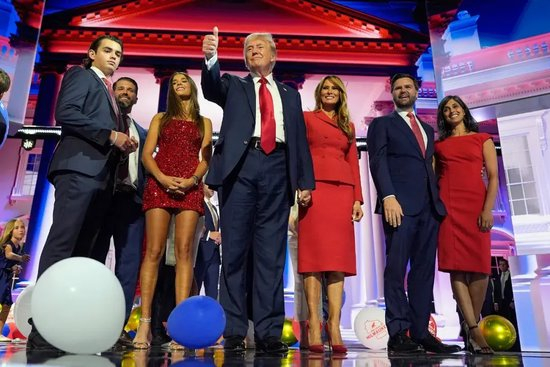 2024年7月18日,为期4天的美国共和党全国代表大会在威斯康星州密尔沃基落下帷幕,特朗普 (中) 和家人与詹姆斯·戴维·万斯 (右二) 夫妇向支持者致意。(视觉中国 / 图)