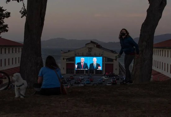 2020年10月22日,美国加州旧金山民众露天观看总统特朗普 (左) 与民主党总统候选人拜登之间的2020年美国总统候选人最后一场电视辩论 。(视觉中国 / 图)