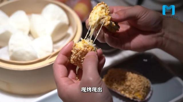 除了这“四大天王”,陶陶居最近还创新了两种新的点心,这里记者就先曝光一个——果仁拉丝酥酥。它里面加了马苏里拉芝士,现烤现出,一口拉丝,口感很丰富。