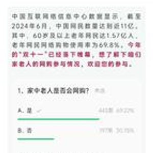 问卷结果显示,参与问卷的网友家中老人年龄在60-70岁的占比62.48%,70-80岁的占比29.98%,而网购的老人占比68.89%,每个月都网购的老人占比超过一半,达到51.99%。
