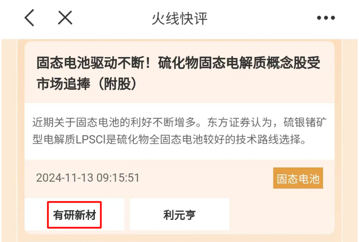 近期固态电解质概念表现较好,本周三开盘前,“火线快评”提到的固态电解质概念表现火爆,一些选手运用“火线快评”抓住了市场机会。