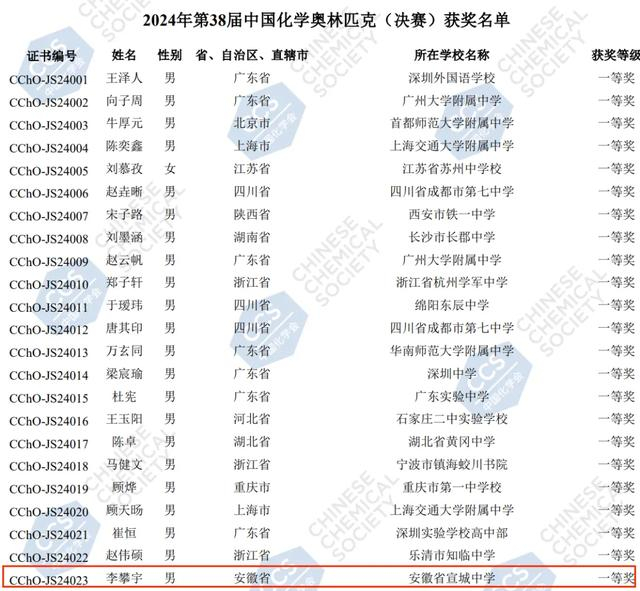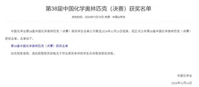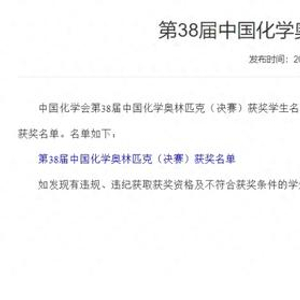 11月14日,中国化学会正式公布第38届中国化学奥林匹克(决赛)获奖名单。名单中编号前50的选手将进入国家集训队,这意味着他们将直接获得保送清华、北大的资格。