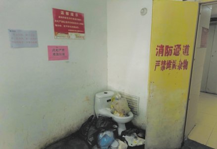 多个楼层的消防通道堆放着生活垃圾。