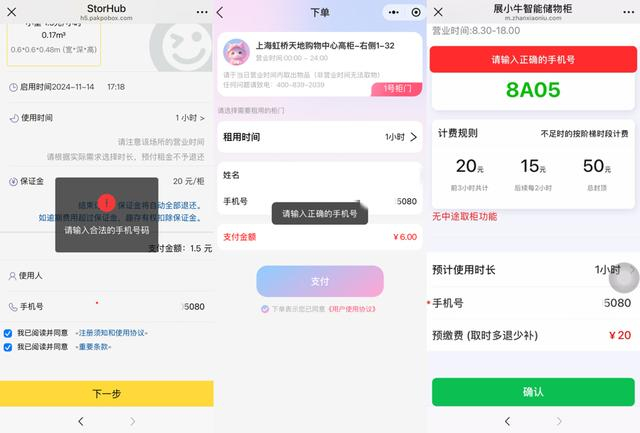 虹桥天地购物中心引进了一批全新的“洛克猫”自助寄存柜,位于商业街hubo通道中央,柜体数量多、位置显眼。用户需下载微信、支付宝使用,扫码后可直接进入寄存界面。然而同样的问题是,需要绑定境内手机号。此外,商场的无线网络也仅支持境内手机号码验证开通,服务台也不支持人工寄存。