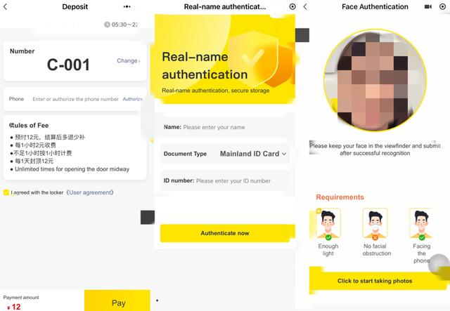 为此,记者使用境外电话号码体验了“小铁”寄存柜的服务。体验发现,微信和支付宝扫码后的流程相似,可直接进入英文寄存页面,此时需要提供电话号码。在输入境外号码后,还要完成实名认证流程:填写姓名、证件类型、证件号码,再进入人脸识别流程,识别成功后才能继续支付。