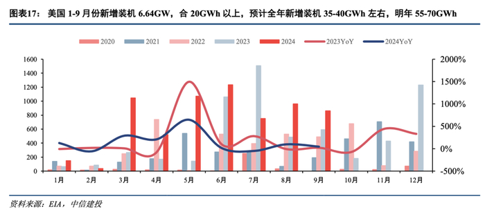 2025年储能展望:预计新增装机220-250GWh,电池需求有望400GWh以上。其中国内120GWh左右,美国55-70GWh。中东大项目进入实施交付阶段,预计达到数十GWh,考虑库存周转、户储需求等预计对应锂电需求400GWh以上。