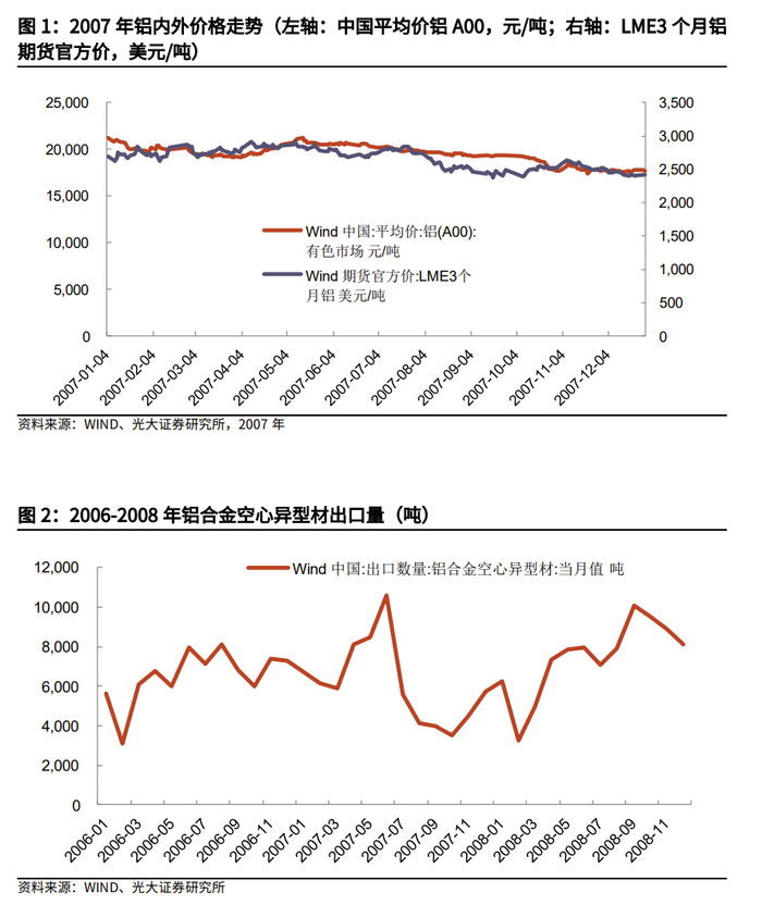 以史为鉴,铝材退税取消后出口量仍有望修复。2021年8月国家发展改革委新闻发布会上曾提及“加强进出口调节”,切实做好大宗商品保供稳价工作的理念。2007年6月19日我国财政部发布调整2831项商品出口退税政策后,2007年7月国内铝合金空心异型材出口数量为5589吨,较2007年6月环比下滑47%,但2008年9月该型材出口量又重新反超退税取消前的2007年6月。考虑到若后续内外铝价价差扩大,国内铝材出口利润回升,仍将修复中长期中国铝材出口量。此次铝材出口退税的取消不涉及高附加值的铝制品等产品,也会刺激国内铝出口企业向高附加值产品出口方向发展。