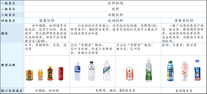 以核心有效成分划分,可以看到,能量饮料的核心有效成分为牛磺酸、咖啡因,更倾向于短期的强功效;而营养素饮料的核心有效成分更多为各族维生素,更加倾向于长期的维生素补充及改善性的功效。不同于前二者,运动饮料的定位处于两者之间,既富含B族维生素等维生素群,可以满足长效的补充需求,又含有电解质、糖分等成分,能够在短时间内快速响应身体的需求进行补充。
