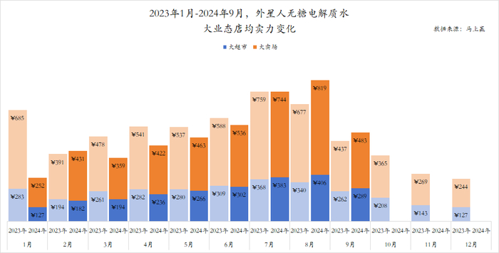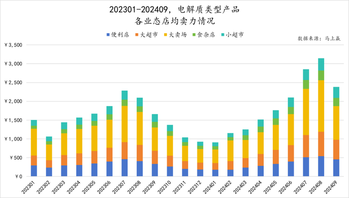 基于马上赢品牌CT中的数据,可以看到自2023年1月起至2024年9月,电解质类产品在各业态中加总的店均卖力基本呈现上升的趋势。从趋势上看,类型产品的店均卖力综合在2024年7、8月基本达到了期内的峰值。从业态构成上来看,除了便利店这一运动饮料的传统强势渠道外,在2024年年内,电解质类型产品在以大业态为主的大卖场、大超市中,店均卖力获得了长足的增长。