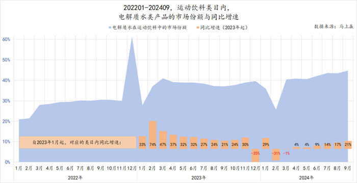 事实也是如此,马上赢品牌CT的数据显示,2022-2024年两年间,除了2024年因与2023年春节错位的原因导致的月份,以及2023年12月同比2022年12月时的特殊情况外,电解质水类产品始终保持着快速的增长,不论冬季还是夏季。