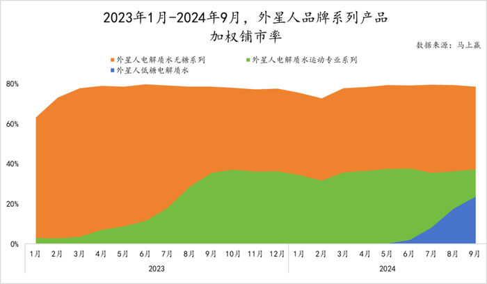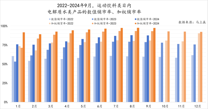 另一方面,进一步观察电解质水类产品在2024年的铺市率情况,可以看到其加权铺市率已经在2024年6-9月接近98%,这也意味着在所有功能饮料的销售渠道当中,电解质水类产品已经基本完成了全面覆盖。
