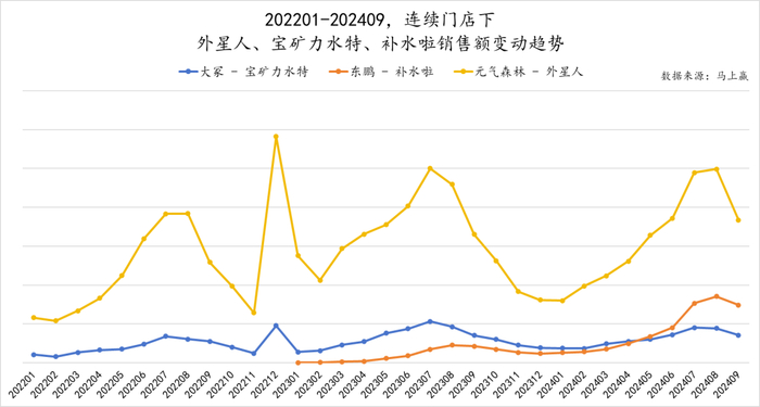 同样以领头羊外星人电解质水为例进行分析,在经历了年初的稳步提升后,其在大业态内的店均卖力于8、9两月开始有明显的同比增长。这也与前文提到的消费者关于电解质水的心智紧密关联,消费者们认可了该产品,所以除了在外随机的即饮需求外,也开始逐步向家内的更多场景进行迁移,并持续复购,这也是饮料从成长到成熟的标志性阶段之一。