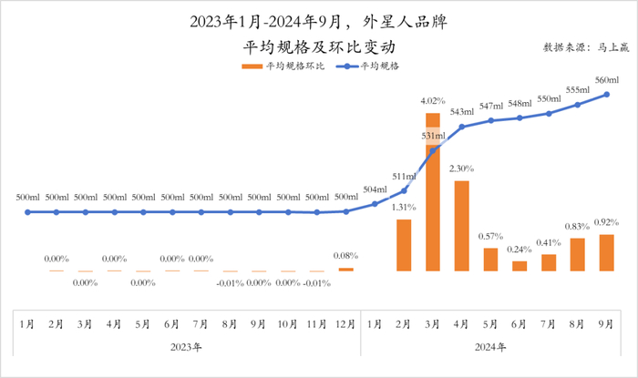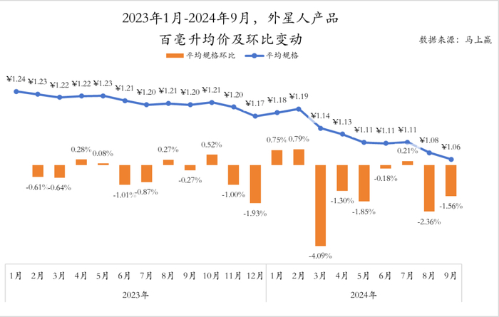 外星人产品的百毫升均价变动呈现出与其规格相反的走势,自2023年1月起便波动下跌,在2024年9月甚至快要探下1元。环比来看,2023年1月至2024年9月也是跌势显著,环比降幅最大时更是达到了4.09%,反观偶尔的几次环比上涨力度则是较为轻微。