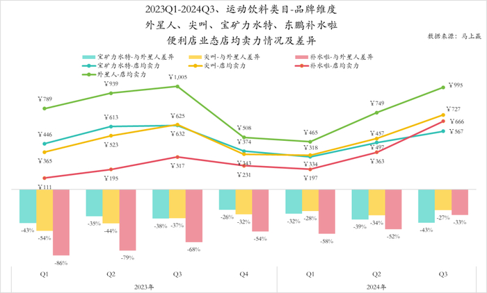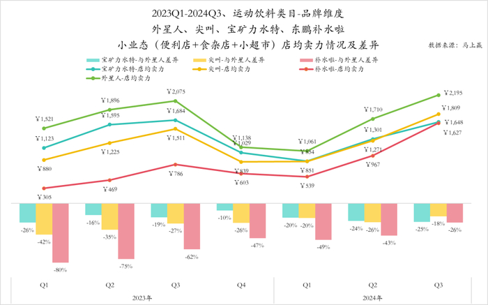 当我们聚焦于小业态内的重中之重——便利店渠道时,外星人电解质水的强势地位便更加突出。同样是观察各大品牌店均卖力之间的差异,可以发现外星人电解质水与其他品牌间卖力的差距相较于小业态内有所拉大。尤其是在刚刚结束的Q3中,宝矿力水特与外星人之间的差异甚至来到了43%,比二者在小业态内的差距更大,这也侧面说明了,外星人电解质水系列产品在以便利店为核心的小业态中的领先。