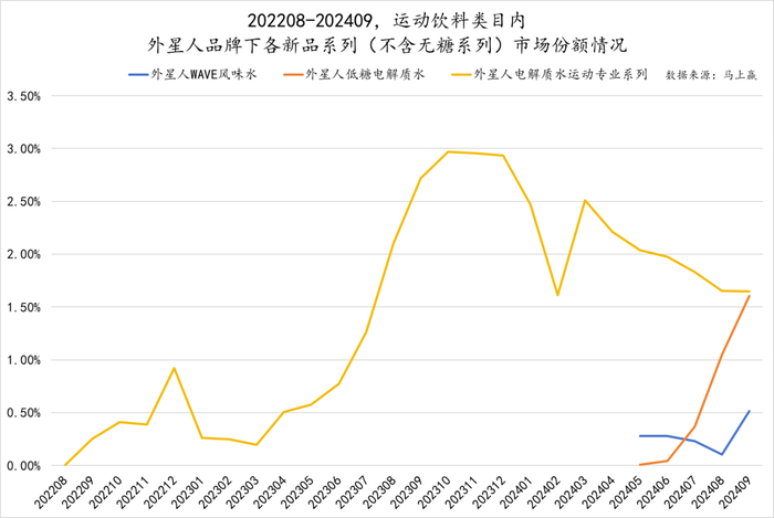 外星人电解质水运动专业系列推出时间更早一些,经历过新品上市所必经的成长期之后,其销售额时至今日已经稳定在2%左右,销售旺季时其市占率更是直逼3%。而wave风味水系列、低糖系列由于推出时间尚短,仍处在起步阶段,市场份额相对而言更低一些,但走势上来看均处在向上发展的通道之中,潜力可见一斑。其中,低糖系列所占份额更是从面市至今不断攀升,2024年9月的市场份额已经达到了1.5%左右。