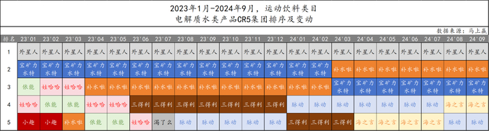 与测评结果显示的电解质种类最多的产品所在集团的优异表现相同,基于马上赢品牌CT中的数据,外星人、宝矿力水特两款产品所在的集团,在2023年1月-2024年9月时间段内,电解质类产品的CR5排名中,也一直处于Top3的位置,其中,外星人更是在时间段内均为市场份额第一的集团。