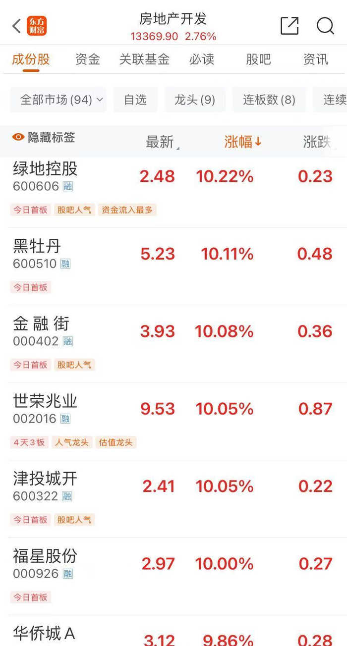 地产板块18日盘中强势拉升,截至上午收盘,绿地控股、金融街、世荣兆业、津投城开等涨停,福星股份、华侨城A涨超9%。值得注意的是,世荣兆业近4个交易日已斩获3个涨停板。