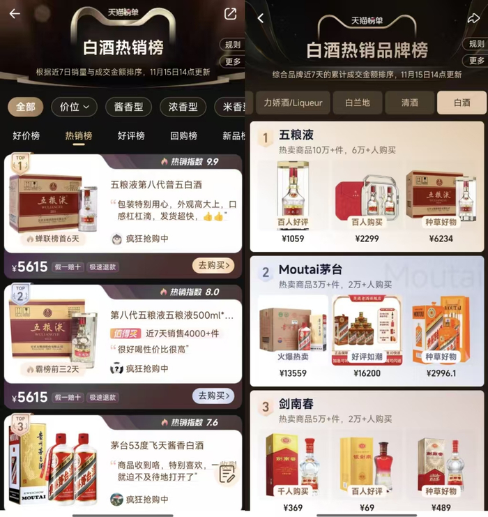 今年的“双11”活动,白酒产品无疑是最受关注的品类之一。在不同平台上,哪些白酒产品最受消费者的欢迎?