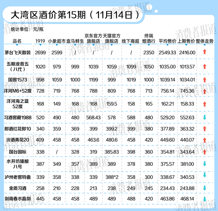 除了习酒以外,水井坊臻酿八号、泸州老窖特曲、剑南春水晶剑的价格均有不同程度的下跌。《大湾区酒价》数据显示,水井坊臻酿八号、泸州老窖特曲、剑南春水晶剑的销售均价分别从10月31日的381元/瓶、340.53元/瓶、468.44元/瓶下降至375.57元/瓶、338.67元/瓶、463.86元/瓶。