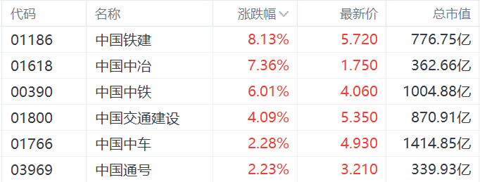 港股市场的“中特估”概念股今日集体走强,其中,估值较低的基建及建筑类股领涨。截至目前,中国铁建涨超8%,中国中冶涨超7%,中国中铁、中国建材涨超6%,中国交通建设涨4%,中国中车和中国通号涨超2%。