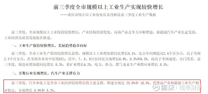 重庆统计局明确指出,规模以上工业增加值快速增长的动力,主要来自汽车与化工产业。前三季度重庆汽车产业增加值增速高达到25.9%,化工产业增速16.8%。