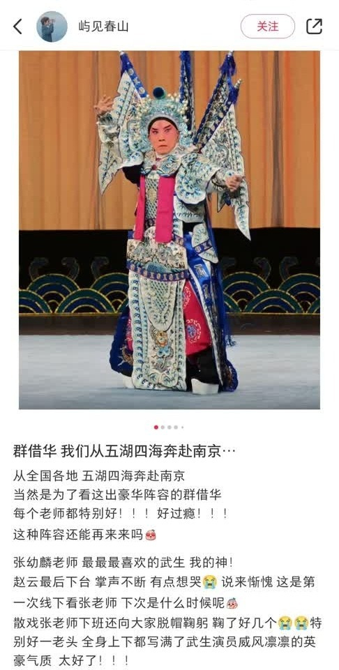 什么“传统戏节奏太慢,年轻人不喜欢”,什么“戏的时间别超过两小时,现在的观众坐不住”,这些统统不存在!明星版《群·借·华》开票10分钟就售罄,演出整整三个半小时,紫金大剧院座无虚席,90后、00后观众占绝大多数,从头到尾没人提前退场,210分钟演出116次满堂彩,平均每两分钟就一次叫好,演出结束谢幕时,年轻观众一遍又一遍喊着“再来一个”,久久不去。如此盛况堪称全国范围内近年来最热烈的京剧演出也不为过。事实再一次证明,好戏、好角儿,从来不缺观众和市场。