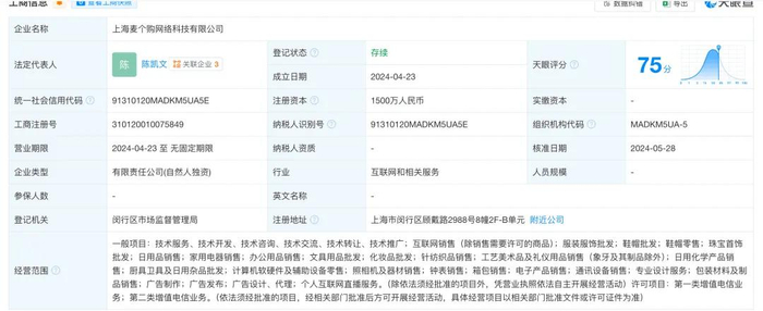 天眼查显示,麦多多隶属上海麦个购网络科技有限公司,成立于2024年4月23日,注册资本1500万元,法定代表人陈凯文,注册地在上海。旗下拥有上海麦优汇网络有限公司、上海沪腾金珠宝有限公司这两家全资子公司,目前这3家公司均处于存续状态。