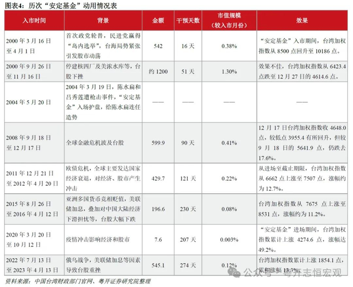 第二阶段:2000年至今,设立“国家金融安定基金”常态化救助机制。2000年1月台湾当局出台《“国家金融安定基金”设置及管理条例》(下文简称《条例》),2月“国家金融安定基金”正式成立(下文简称“安定基金”),资金规模上限5000亿新台币。根据台湾地区财政部门数据,成立以来,“安定基金”8次入市,其中多次是出于政治考虑。例如,2000年3月“安定基金”首次入市,主要是为了稳定因台海局势紧张带来的股指波动。又如,2004年“安定基金”入市,或出于稳定“岛内选举”的考虑(见图表4)。