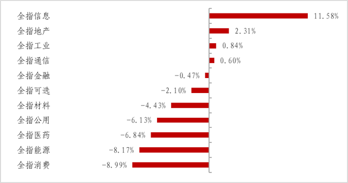 中证全指一级行业指数涨跌不一,其中全指信息、全指地产、全指工业行业指数分别上涨11.58%、2.31%、0.84%。