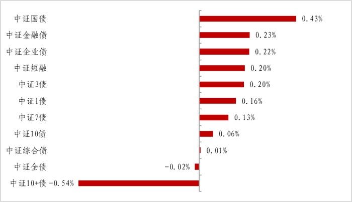 分期限来看,中证1、3、7、10、10+债指数涨幅依次为0.16%、0.20%、0.13%、0.06%、-0.54%。分品种来看,中证国债、中证金融债、中证企业债、中证短融指数分别上涨0.43%、0.23%、0.22%、0.20%。