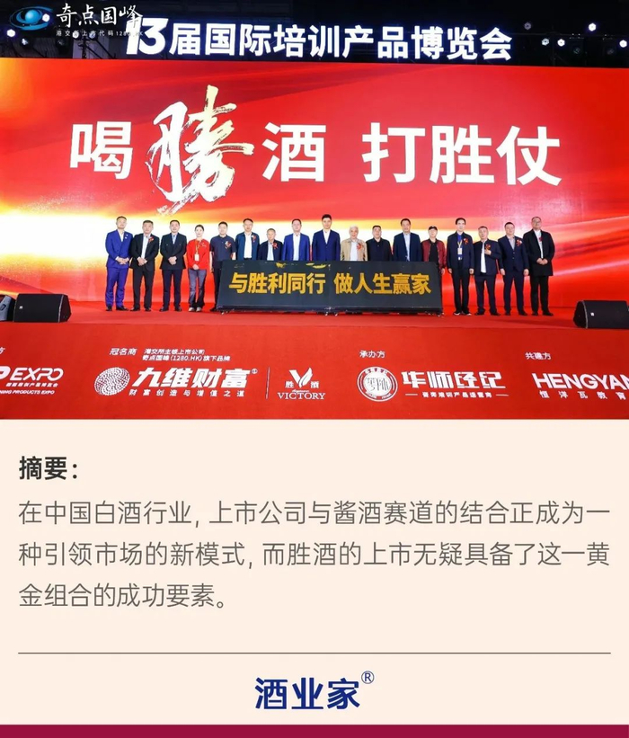 11月15日,第十三届培博会在苏州昆山隆重开幕,奇点国峰(股票代码:1280.HK)借此机会举办了旗下酱香型白酒品牌——胜酒的上市发布会。