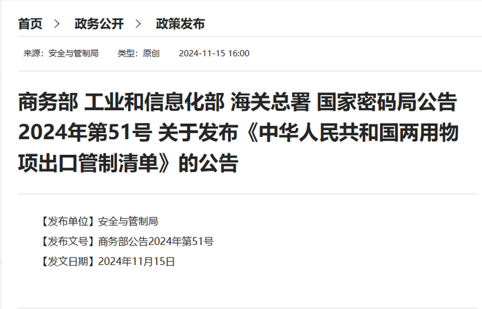 11月15日,商务部、工业和信息化部、海关总署、国家密码局发布关于《中华人民共和国两用物项出口管制清单》的公告。