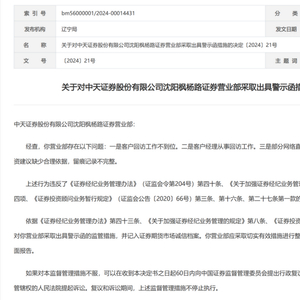 财联社11月18日讯(记者 陈俊兰)11月18日,辽宁证监局披露了两张与直播违规相关的罚单,涉及中天证券沈阳枫杨路营业部及营业部负责人。