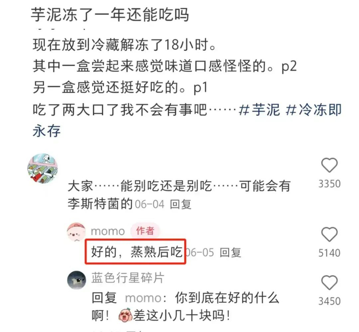 有网友发帖询问“芋泥冻了一年还能吃吗”,高赞评论劝她能别吃还是别吃、可能有李斯特菌。