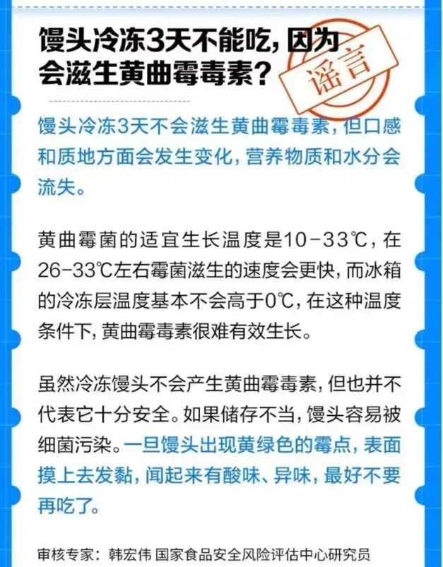 前两天刷到一条乍一看非常耸人听闻的词条——“冷冻馒头超过两天会长黄曲霉素”。