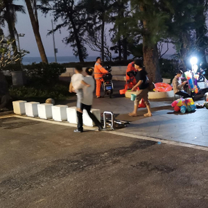 记者近日根据市民报料前往现场查看情况,发现在西秀海滩一带的亲海健身漫步道上多处位置有流动商贩在经营,摊车还开着各种颜色的灯光,有的还播放着广告、放着比较大声的音乐。在靠近停车场的亲海健身步道的一处区域,本来道路已经比较窄小,却有近10个流动摊贩沿着路摆摊,还有的几乎占据了一半了道路。这里的摊贩售卖各类小吃饮料,比如椰子水、烤肠烤串、麻辣烫等等。